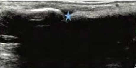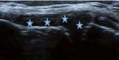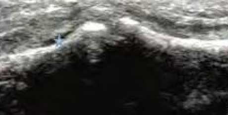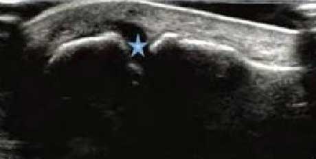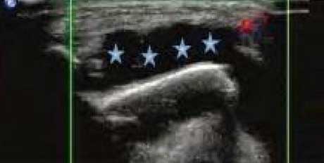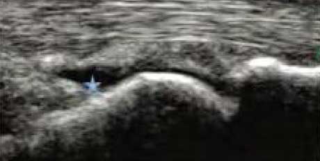 类风湿关节滑膜炎症会导致滑液渗出不断增多,形成关节腔积液。肌骨超声 少可发现1ml的积液,能对关节腔积液量及位置准确定位,通过检测判定关节腔内液性边界清楚的无回声区、细点状回声或细微的低回声条纹,判断其宽度和深度衡量积液量的多少,进而评估RA的严重程度。