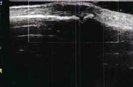 暗区内有团状高回声,可见深度达6.46mm液性暗区